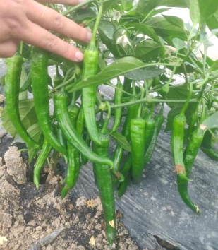 ‘赣椒16号’是江西省农业科学院蔬菜花卉研究所选育的早熟抗病辣椒杂交品种。品种来源为C004 × C001。该品种成株株高约58.0 cm,开展度66.0 cm,株形紧凑,分枝多。早熟,始花节位11~12节。主茎直立,叶绿色。果实羊角形,纵径21.0 cm,横径1.5 cm,果肉厚0.2 cm,平均单果质量19.5 g;果面光滑顺直,商品果青熟时为深绿色,生物学成熟果鲜红色,辣味较强。青熟果辣椒素 + 二氢辣椒素含量170.2 mg/ kg,维生素C含量98.4 mg/100 g,17种氨基酸总含量1.01 g/100 g,风味好,品质佳,抗疫病。长江流域春夏季栽培从定植到采收青果约需42 d,全生育期约270 d。2020年4月通过国家非主要农作物品种登记[GPD辣椒(2020)360197]。适宜长江流域及气候相似地区春提早、秋延后大棚设施栽培及露地栽培,南昌地区春早熟栽培一般上年10月下旬至12月上旬播种育苗,2-3月大棚定植;设施秋延后栽培7月下旬左右播种,8月下旬定植。定植密度2800~3200株/亩。